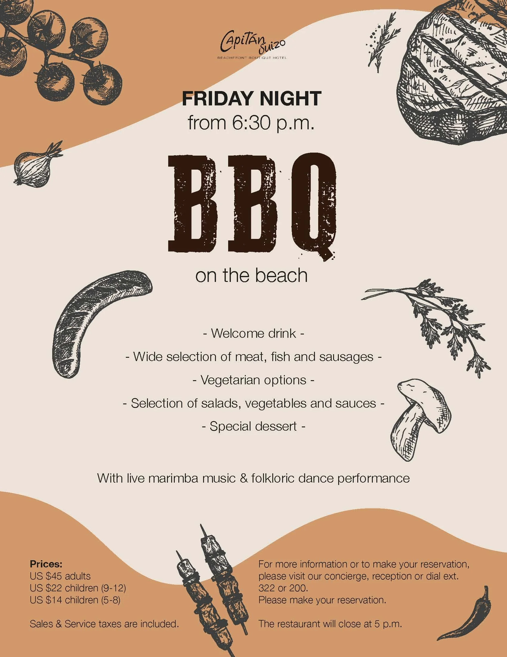 Notre restaurant est situé directement sur la plage et offre une ambiance tranquille, entouré de nature. Le copieux buffet petit-déjeuner ainsi que nos dîners et soupers à la carte, proposant une cuisine mixte de plats internationaux et de cuisine classique du Costa Rica, peuvent être savourés quotidiennement. Nous proposons également des dîners aux chandelles pour ceux et celles qui souhaitent passer une soirée romantique au clair de lune, avec une vue sur l'horizon infini de l'océan Pacifique. Deux fois par semaine, le dîner est accompagné de musique live Marimba.